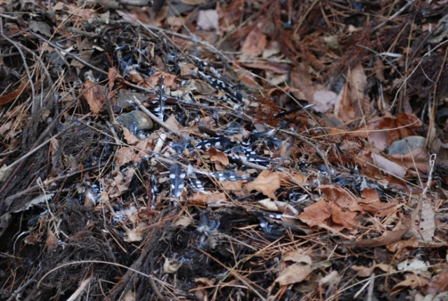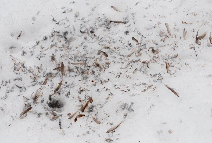 ヤマドリが何者かに捕食された跡。この辺で見かける猛禽類はハイタカやノスリなどで、ヤマドリを襲うとは思えません。 ホンドギツネかホンドテンの犯行かと思います。