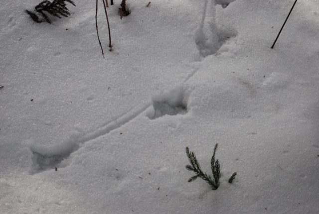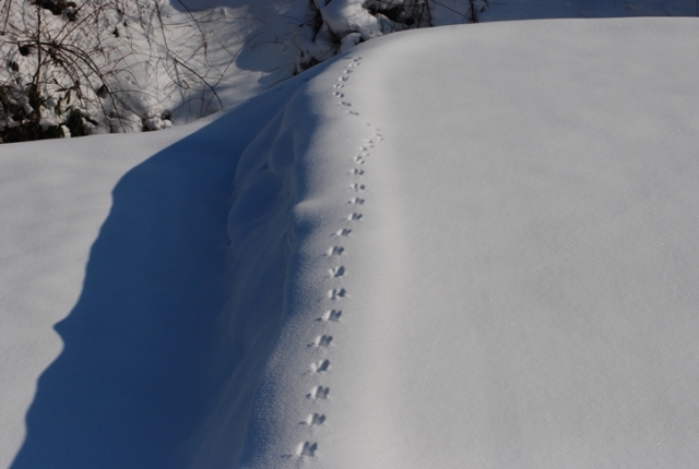 アカネズミの足跡。雪の上に林道の端から端を横切るアカネズミの足跡を見ることがあります。両端にはトンネルの小さな入口が開いています。細長い線のようになっているのは尻尾の跡です。