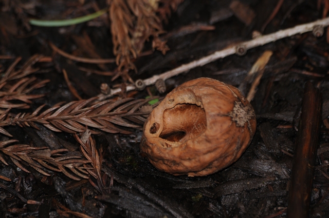 アカネズミがオニグルミを食べた跡。 日本でオニグルミの硬い実を食べる動物は、アカネズミとニホンリスだけです。クルミの繋ぎ目を齧ってカパッと二つに割ってお皿のようにしてから中身を食べるニホンリスに対して、 アカネズミはクルミの膨らんだ部分に穴を開けて中身を食べます。