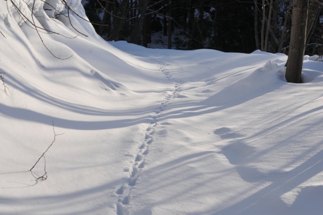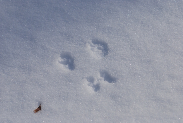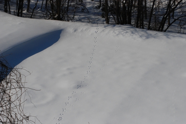 トウホクノウサギの足跡。足跡はよく見るのに姿は滅多に見られないトウホクノウサギ。足跡を追ってみても途中で途切れることが多くノウサギまで辿り着きません