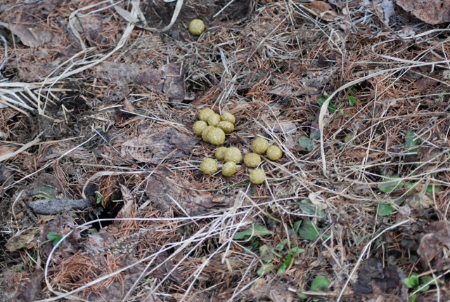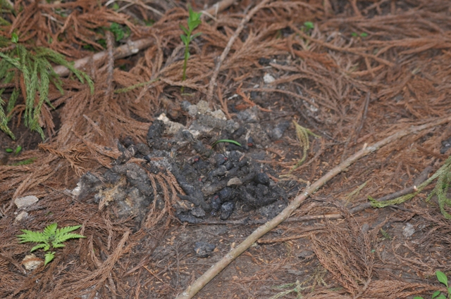 ニホンカモシカの糞。カモシカは一ケ所にまとめて糞をします。ヤギの糞に似て、黒くて細かいです。近年増えてきたニホンジカ の糞はもっと大きくて黄土色、パラパラと広い範囲に落ちている違いがあります。