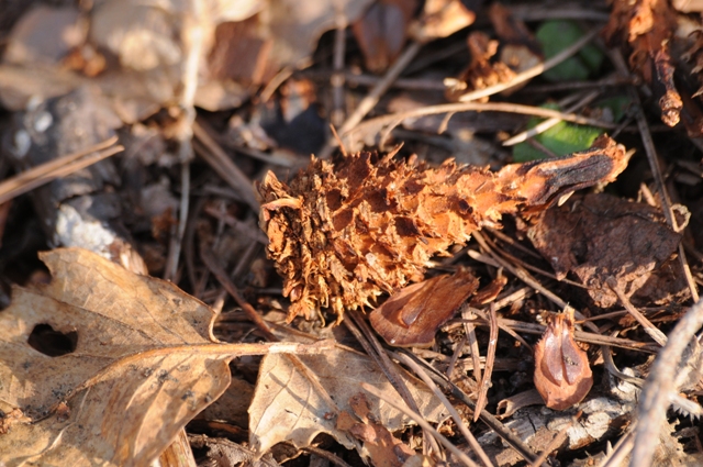 ニホンリスがアカマツの松毬(まつかさ)を食べた跡。 リス好きな人たちはこれをエビフライと呼びます。齧り残した松毬の先端の鱗片がこげ茶色で、いかにもエビフライの尻尾のように見えます。鱗片をはぎ取られた軸は先端が膨らんだ明るい茶色で、 これもエビフライが思い浮かぶような形と色をしてますね。