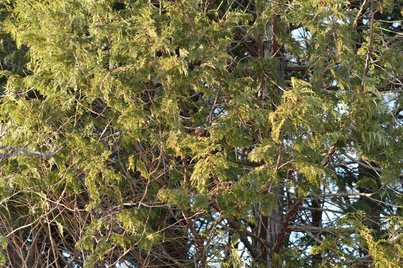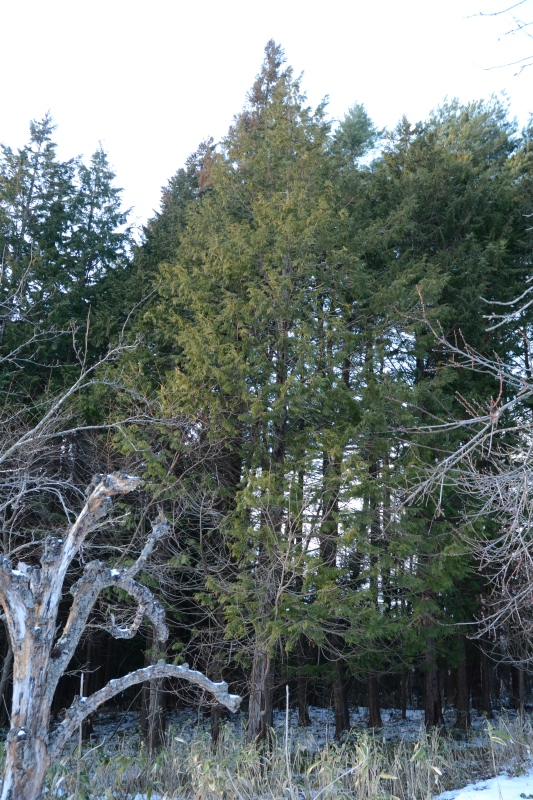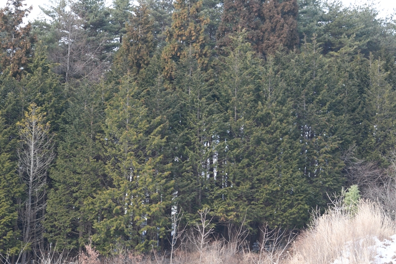 1月7日。畑に囲まれた場所にあるヒノキの林。生息地には、山腹や尾根などの乾燥する場所が適しています。