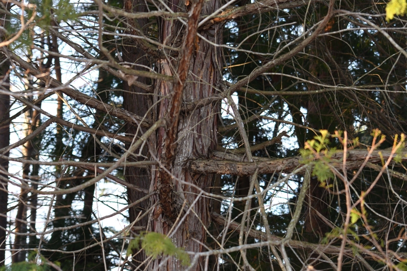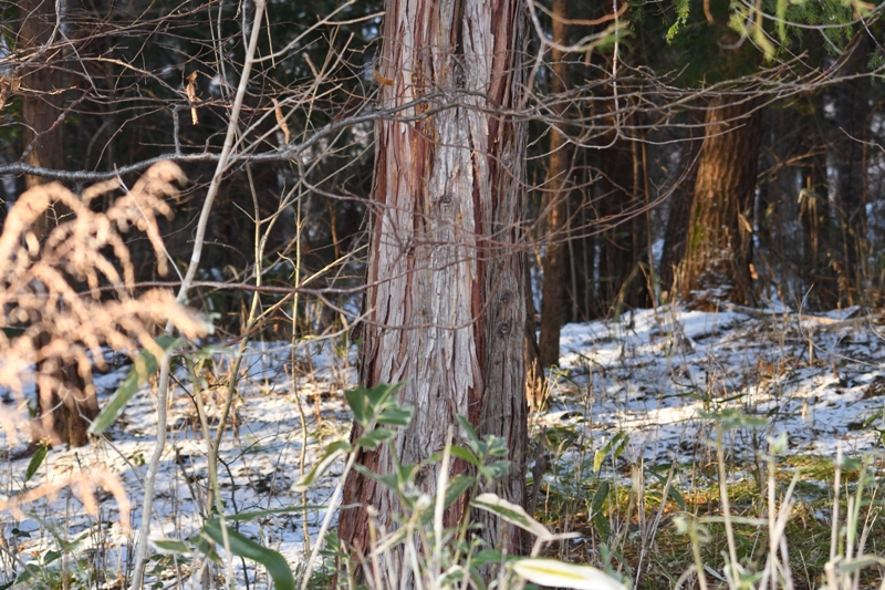 ヒノキの幹。スギより赤みの強い茶色で縦に粗く裂けます。