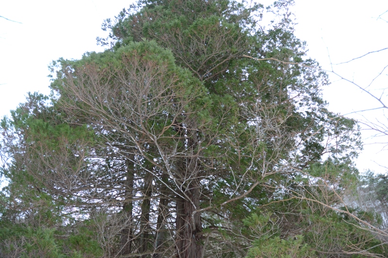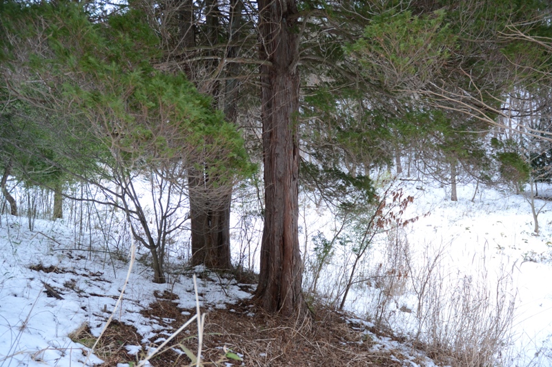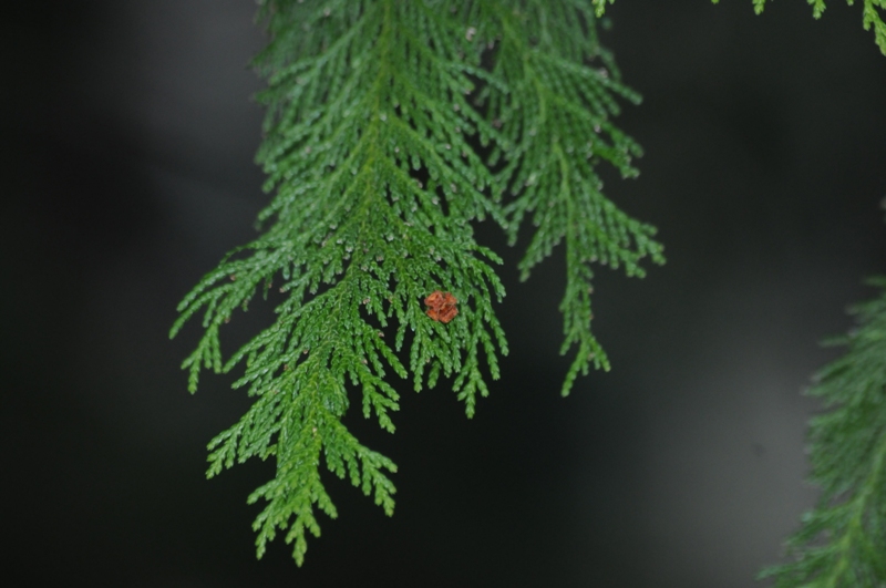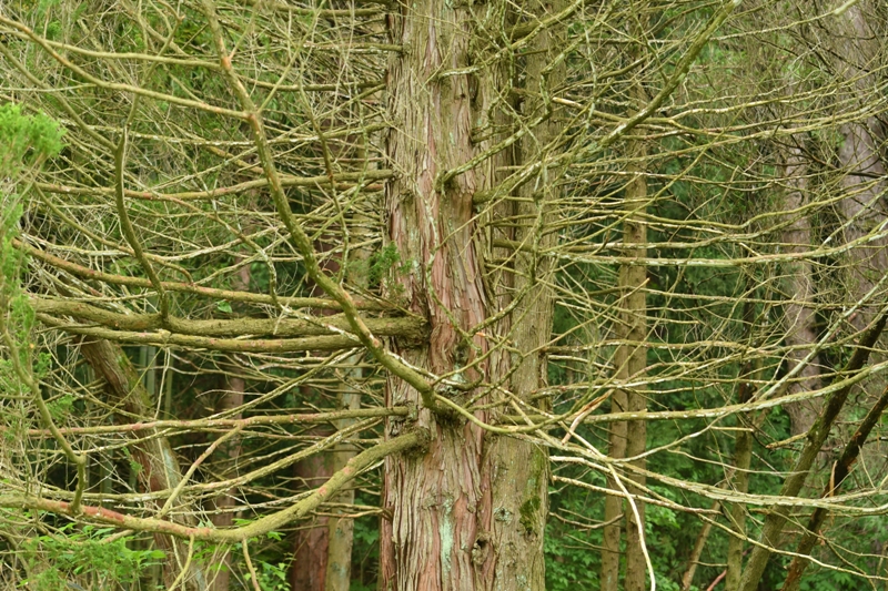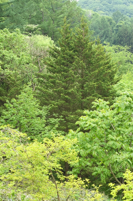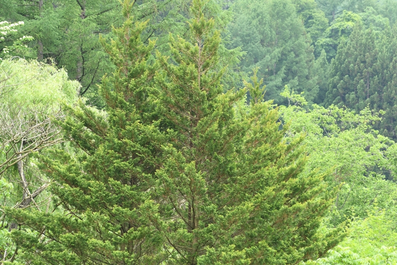 サワラ遠景。ヒノキはまとめて植林されてヒノキだけで林になっていることが多いのですが、サワラは疎(まば)らにしか見かけません。