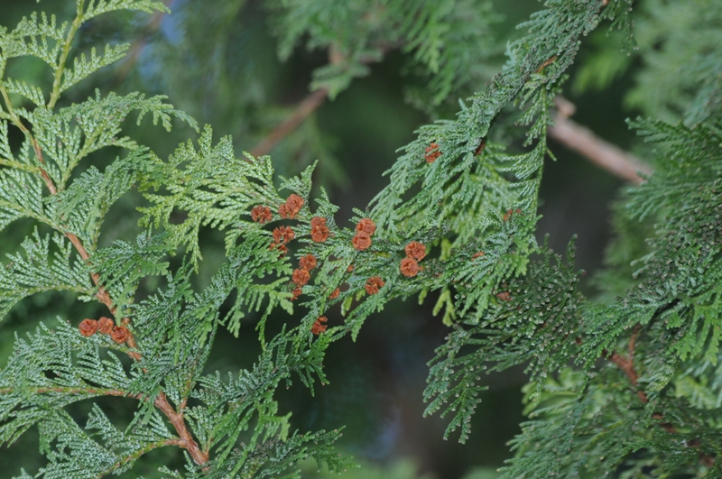 球果は直径約7mm、開花した年の10月頃に熟すします。ヒノキの球果より小さくて、やや柔らかくなります。 果鱗は10~12個、種子は長さ2~2.5mmの長楕円形で両側に広い翼があります。