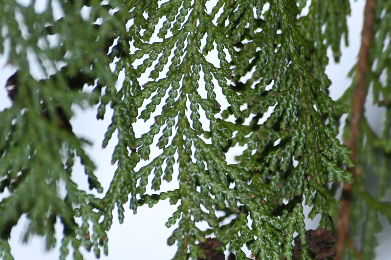 葉は十字対生、長さ3mmほどの鱗片状で多くの先端は針状に尖る。ヒノキに比べてやや薄く、光沢もあまりない。 裏面の気孔帯はX字形になっていて、Y字型のヒノキと見分けるポイントになっています。