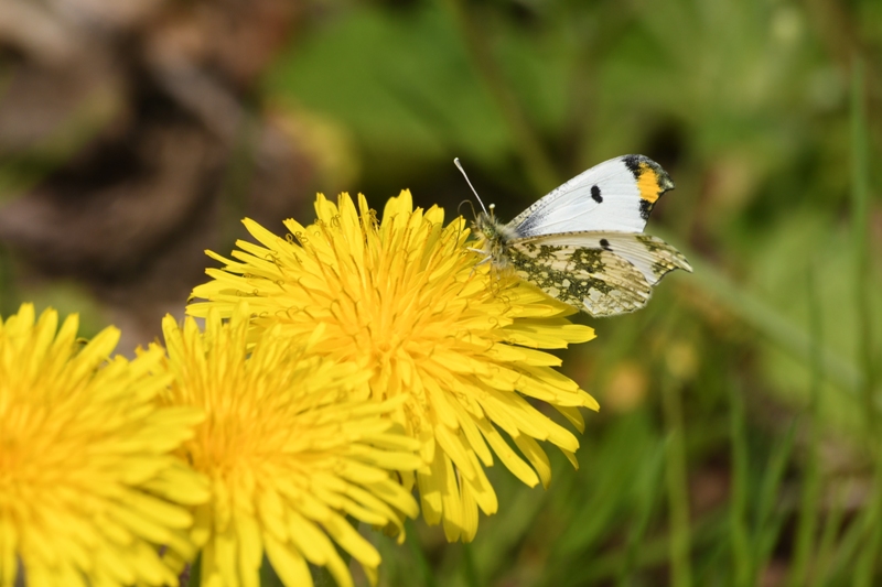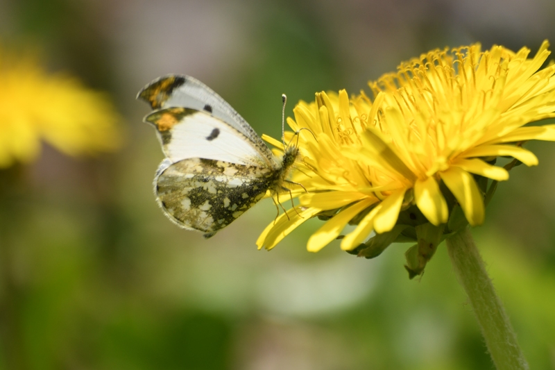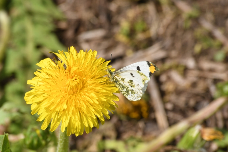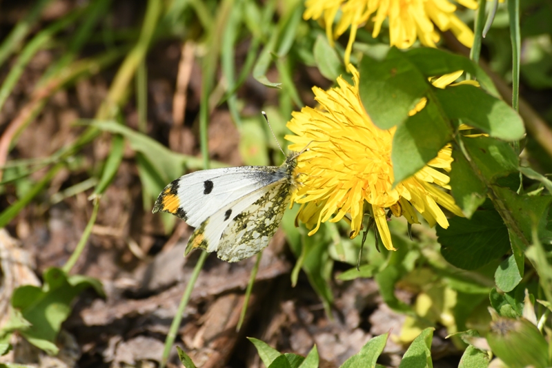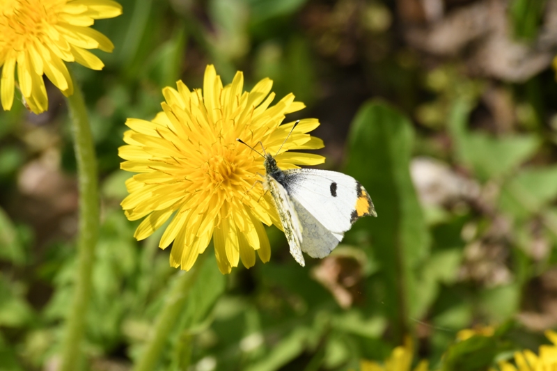 その中に前翅の先がオレンジ色で翅の裏がとろろ昆布模様になっているシロチョウが2匹飛んでいました。ツマキチョウです。ときどきタンポポにとまって吸蜜します。