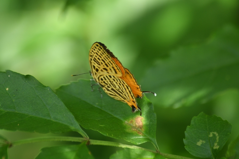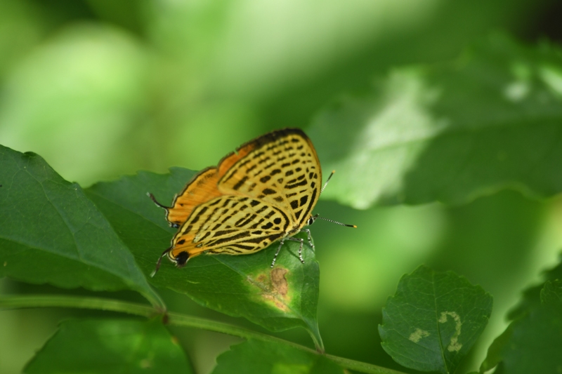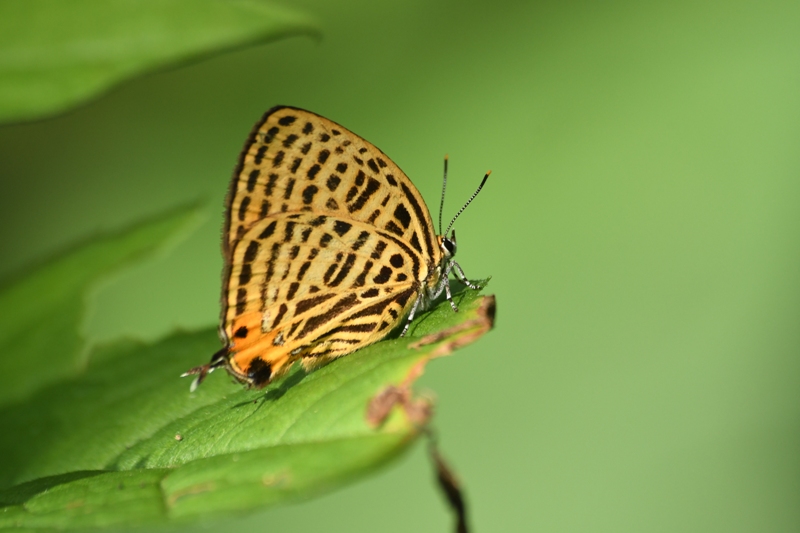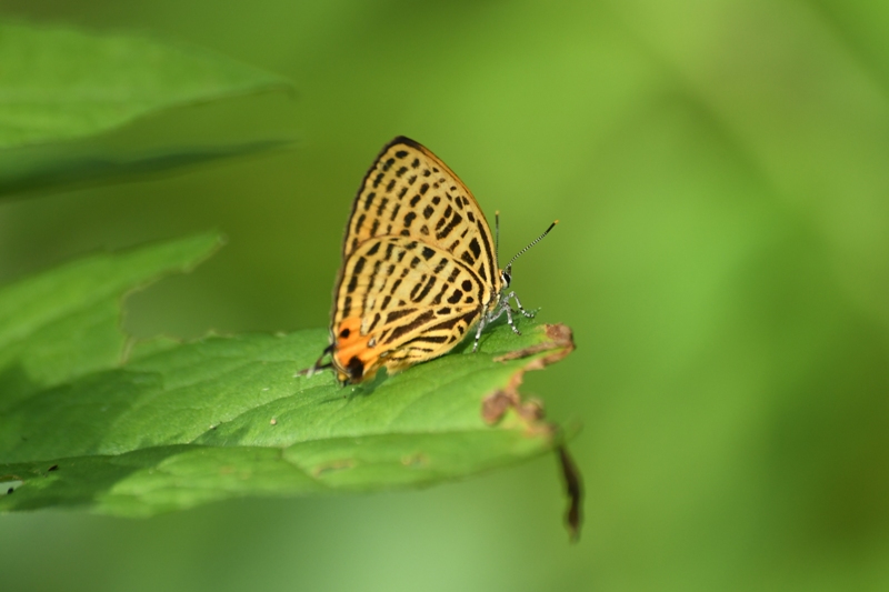 低い木の葉にウラナミアカシジミがとまってました。遠くからでも、黄橙色に黒のゼブラ模様が鮮やかできれいに見えます。