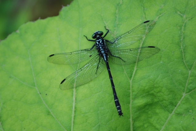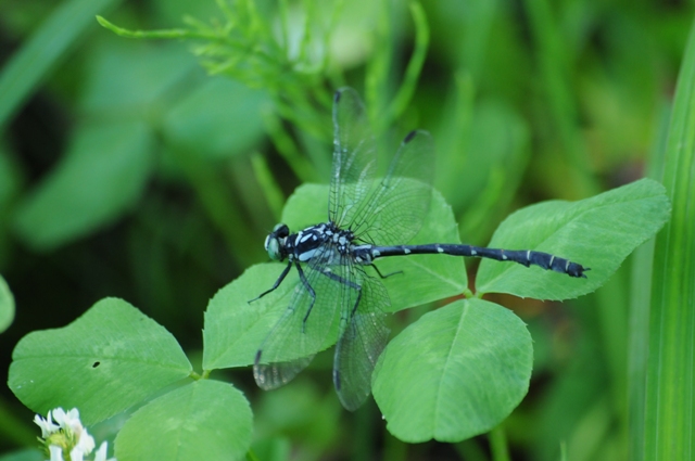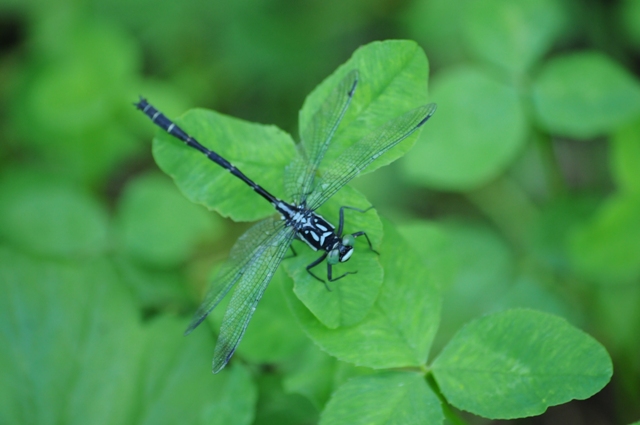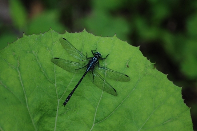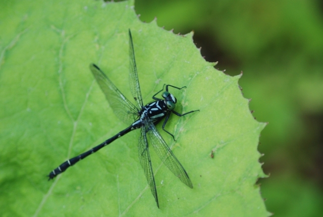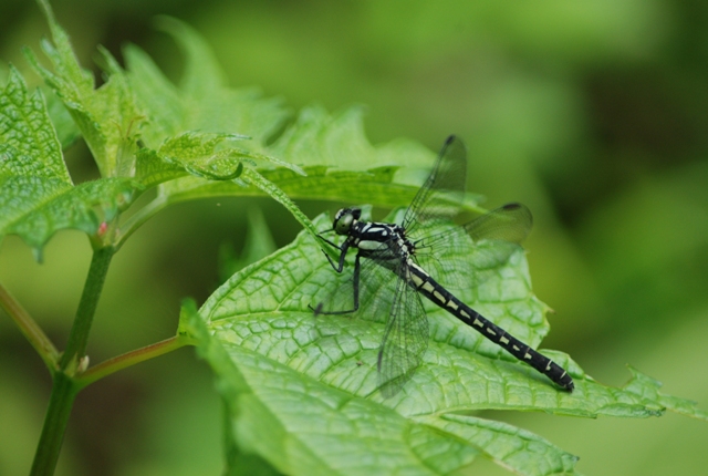 ダビドサナエの雄。6月下旬から7月上旬にかけて、川の側で見かけます。いつも葉の上に静かにとまっています。