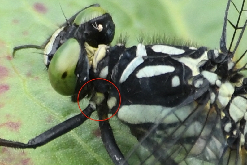 ダビドサナエの雌の特徴。図鑑には前脚の付け根と顎に黄色い部分があることが、クロサナエとの違いとして記載されています。 それから、黄色が3本ある胸の縞模様は、黄色が2本のモイワサナエと見分けるポイントです。