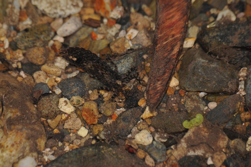 5月7日。ひっくり返した浮石の下にいたヤゴ。細長い体をしています。