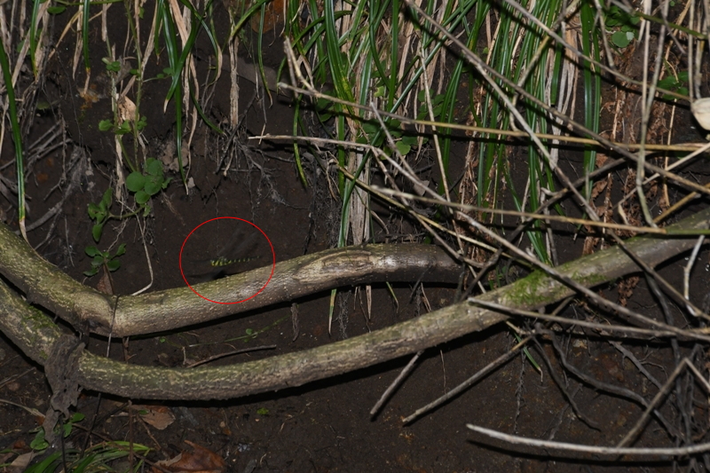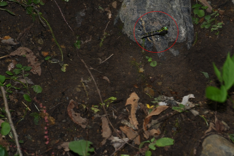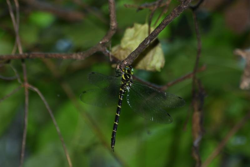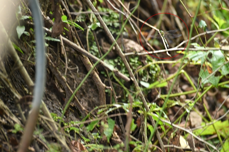 8月31日15時過ぎ。沢の上流、木々に囲まれた場所です。縄張り争いをしているのか、2匹のミルンヤンマが沢のすぐ上を旋回しながらバチバチぶつかり合っています。 ときどき、ひざ元でホバリングしたりもします。そこで撮影に挑戦。結果、記録写真のみでした。