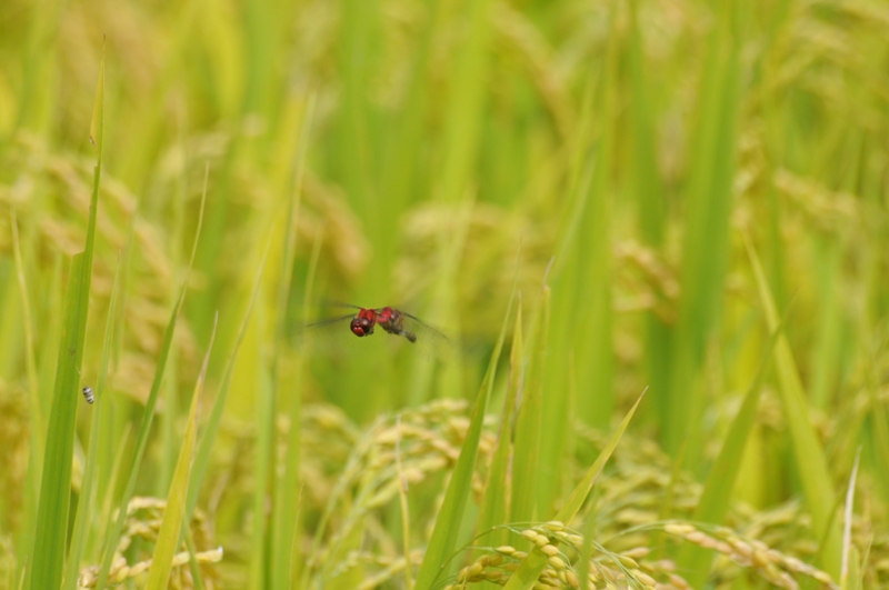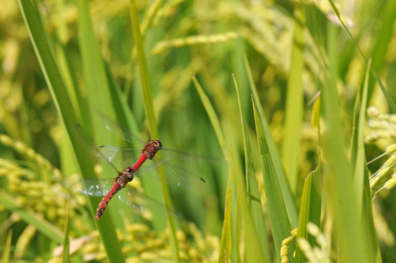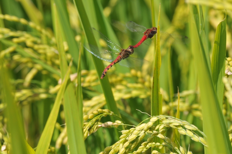黄金色になってきた稲の中をナツアカネの番が飛んでいました。番で連結したまま緩やかに飛びながらときどき打空して空中で卵をばら撒く連結打空産卵、 または雌単独で打空して空中で卵をばら撒く単独打空産卵を行います。 卵の期間は半年程度、卵で越冬します。幼虫期間は3~5ヶ月程度で1年1世代。