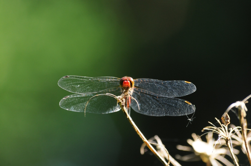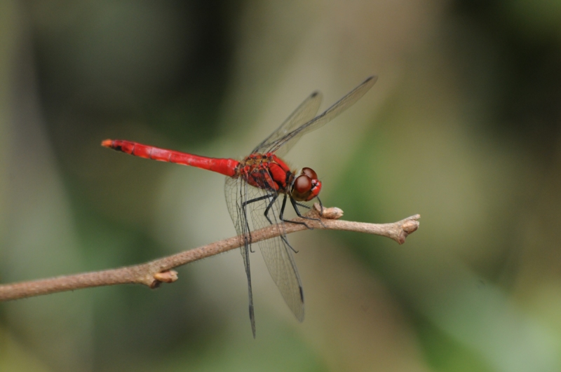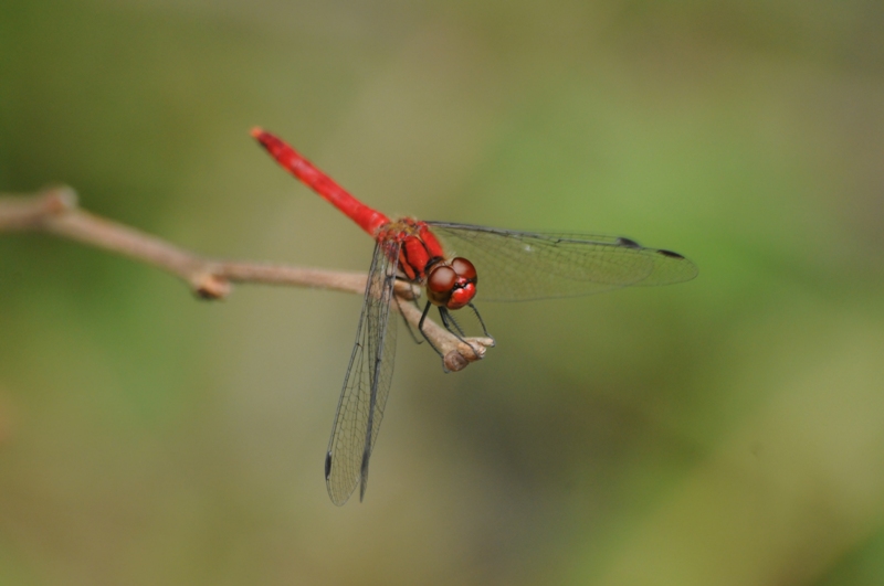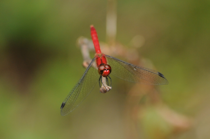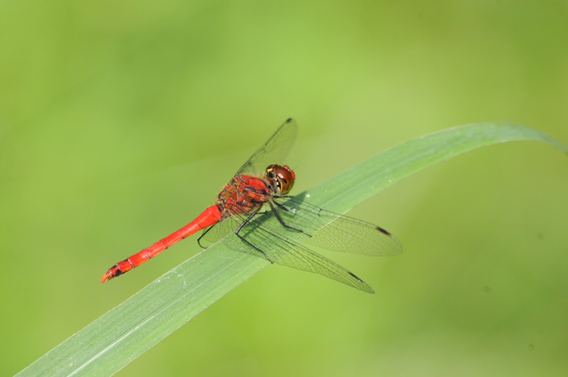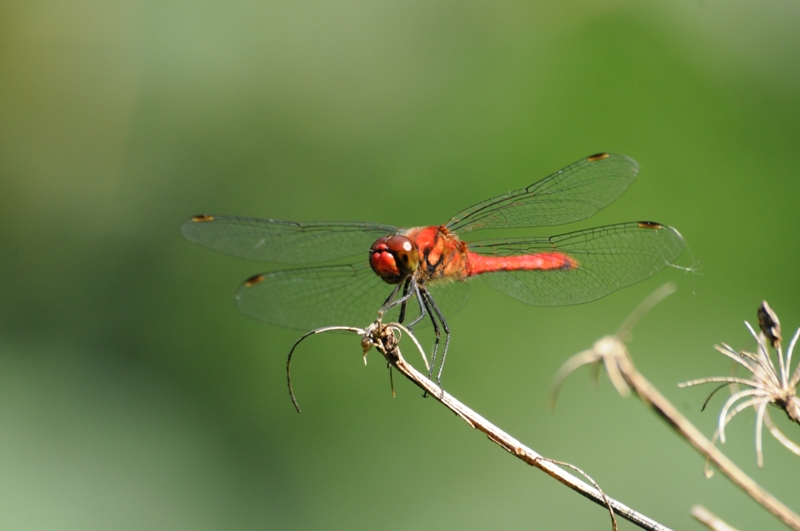 ナツアカネの雄。9月になると腹部から胸まで赤くなり、他のアカネ類と見分けやすくなります。 成熟雄は水辺の植物にとまって雌を待ち、他の雄が近づくと追い返すがはっきりした縄張りは持っていません。