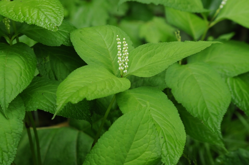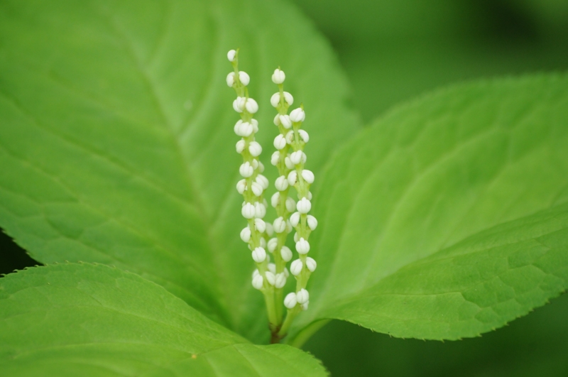 6月12日。ヒトリシズカの花の後、しばらくしてから花を付けます。果穂は2個のものが多いのですが、1個や3~5個付けるものもあります。 葉は光沢がなく、縁に細かい棘(トゲ)状の鋸歯があります。