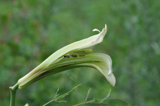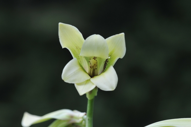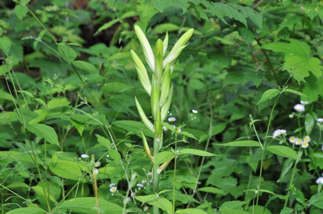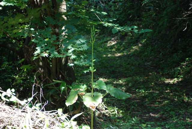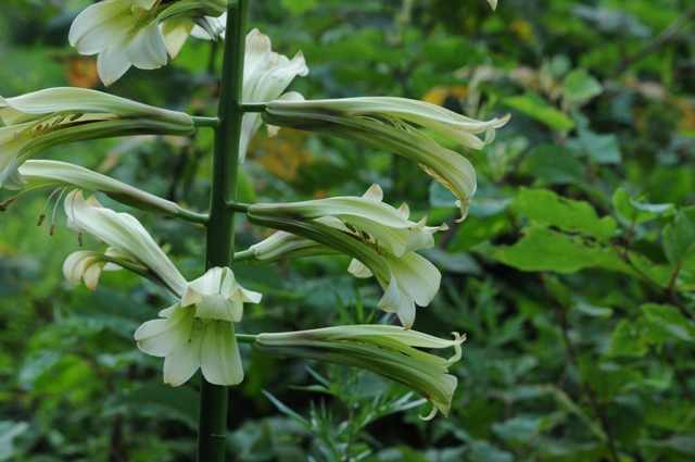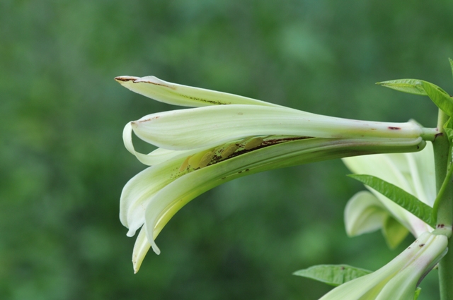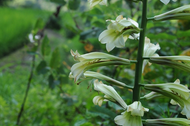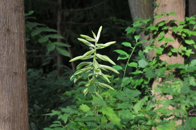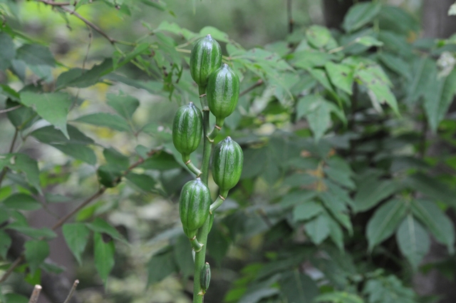 8月中旬になると、青い瓜みたいな実をつけます。姥百合(ウバユリ)の名前の由来と違い、本当は花が終わった後も葉が残っています。