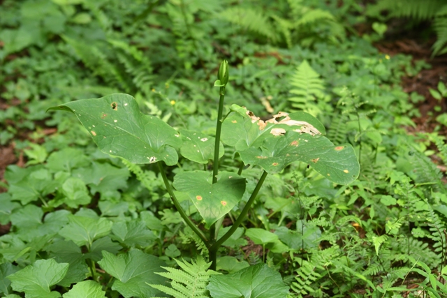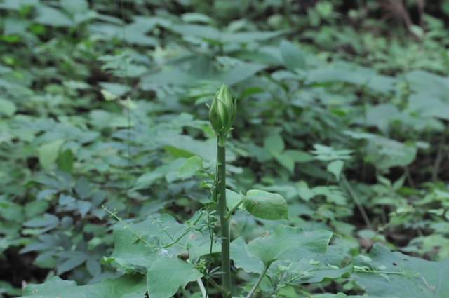 最初の頃は、茎の先に蕾が一つ膨らみます。この後、茎が上に真っ直ぐ伸びていきます。茎の下の方に5~6枚の葉がつきます。 葉の形は卵状楕円形で基部は心形、長い柄があります。