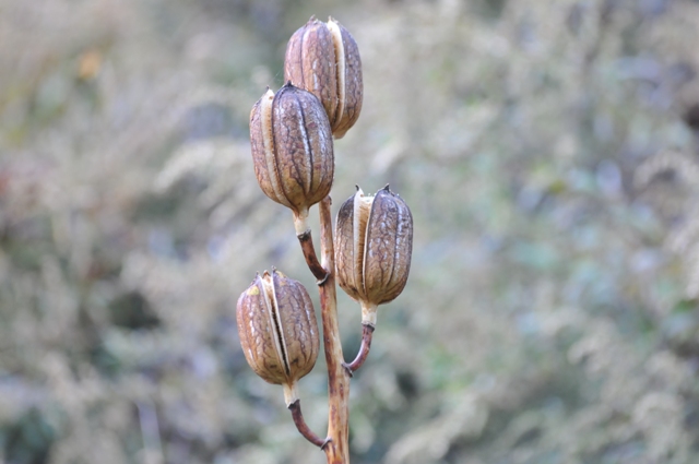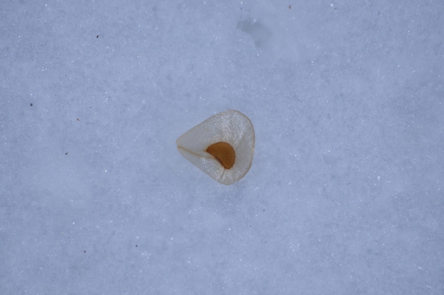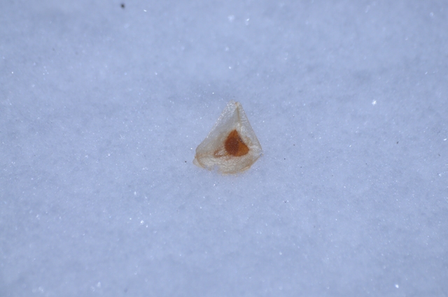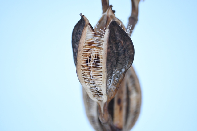 冬になると、実は茶色く乾燥します。実が開き、細かい柵の中にバナナチップみたいな種が重なっているのが見えます。
