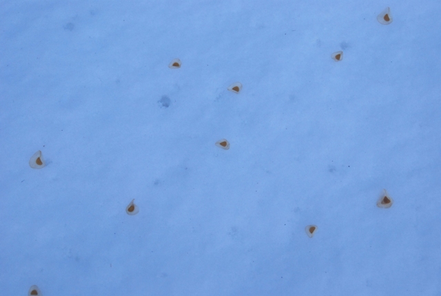種の周囲に翼があります。でも、遠くまで飛ばされている種を見かけたことがなく、オオウバユリの株の周囲に散らばっていることが多いです。