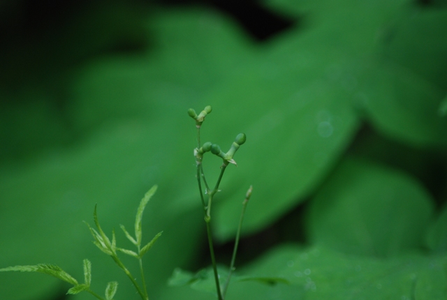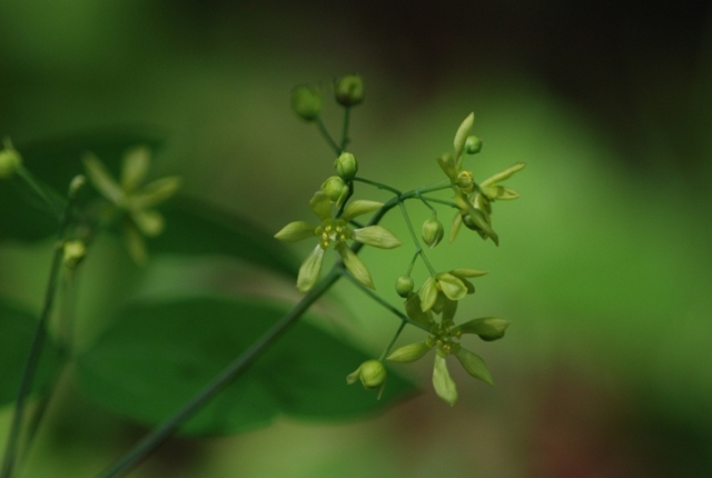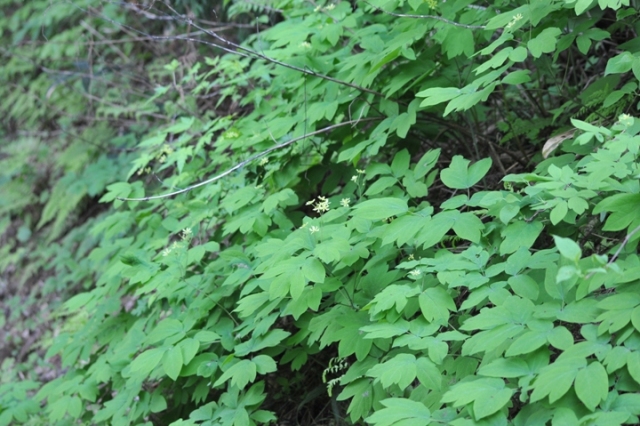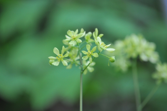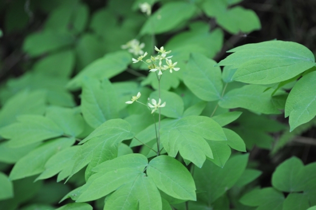 5月中旬、茎頂に花が数個咲きます。花の外側の花弁のように見える黄緑色の6枚は内萼片。内側の1cmくらいの集散花序が本来の花。 全縁(縁が滑らかでギザギザがない)の葉は茎の上部に二つ、下の葉は3回3出複葉。小葉は卵形~長楕円形で長さ4~8cm、2~3裂することがある。